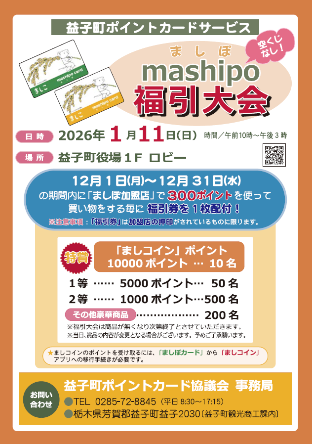 2025年12月1日(月)~12月31日(水)の期間内にましぽ加盟店で300ポイントを使って買い物をする毎に福引券1枚を配布します